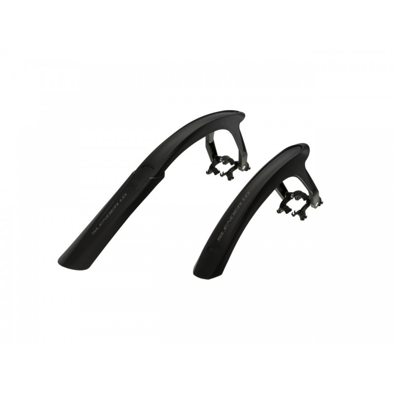 SLENDER 1.0 to błotniki przeznaczone do rowerów szosowych/gravelowych, chroniące przed wodą i błotem na mokrym asfalcie i w terenie. Są wykonane z wytrzymałego tworzywa sztucznego, a ich spód jest gładki dla lepszego odprowadzanie błota. Ich opływowy kształt skutecznie minimalizuje opór powietrza. Przedni błotnik jest mocowany do widelca za pomocą adapterów i 4 gumowych O-ringów. Tylny błotnik jest montowany do górnej części widełek za pomocą regulowanych wsporników.