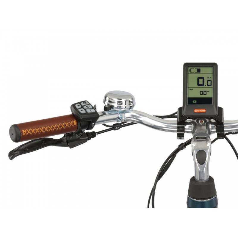 W zestawie znajduje się także wyświetlacz Bafang, pozwalający na odczyt najważniejszych informacji związanych z jazdą. Dowiesz się z niego w jakim trybie pracuje aktualnie silnik oraz o stopniu naładowania baterii.