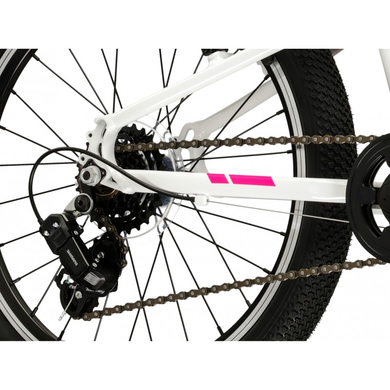 Rower wyposażono w 6-biegowy napęd Shimano, który pozwala na łatwe dopasowanie przełożeń do warunków jazdy. Tylna przerzutka Shimano Tourney TY21 jest trwała i niezawodna, zapewniając płynną zmianę biegów.