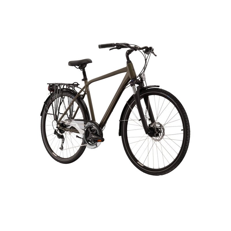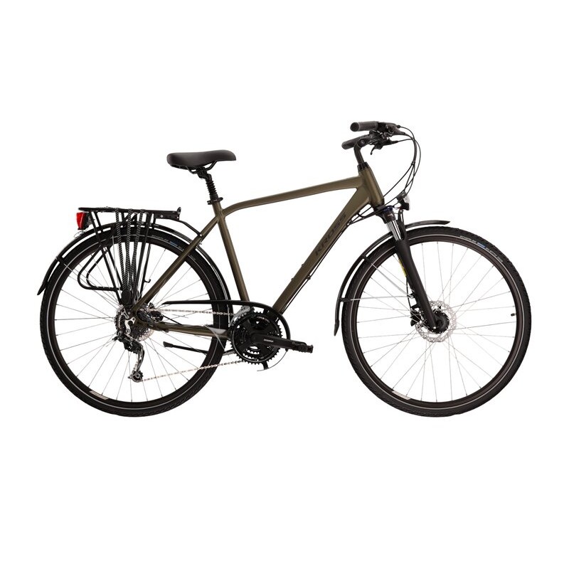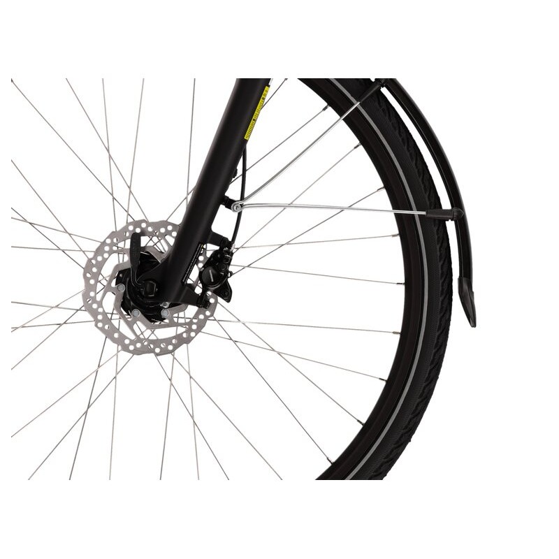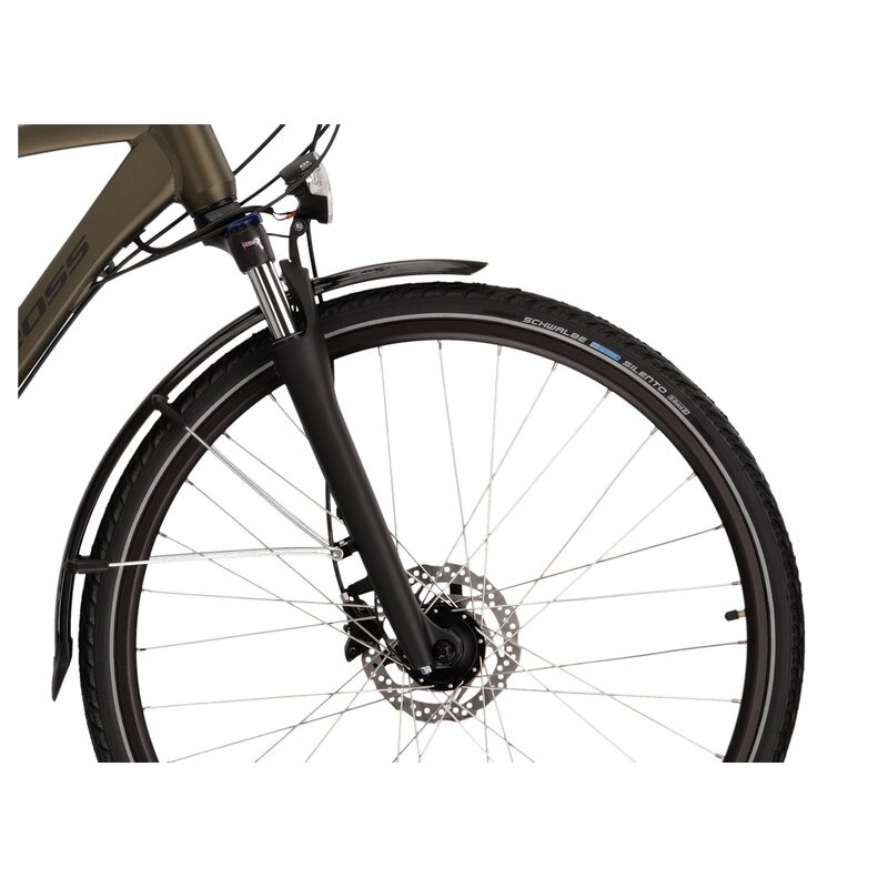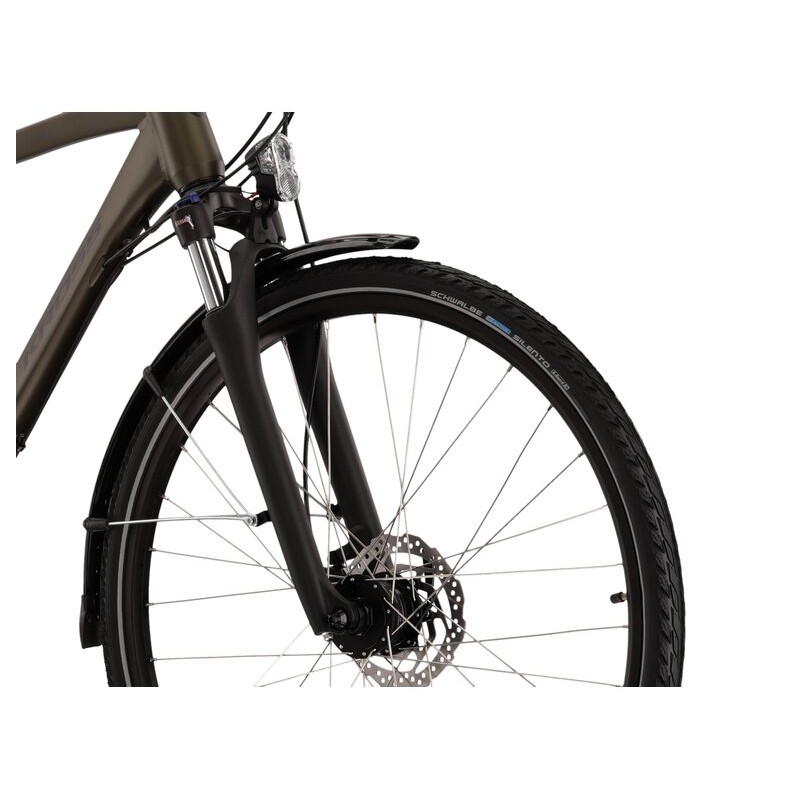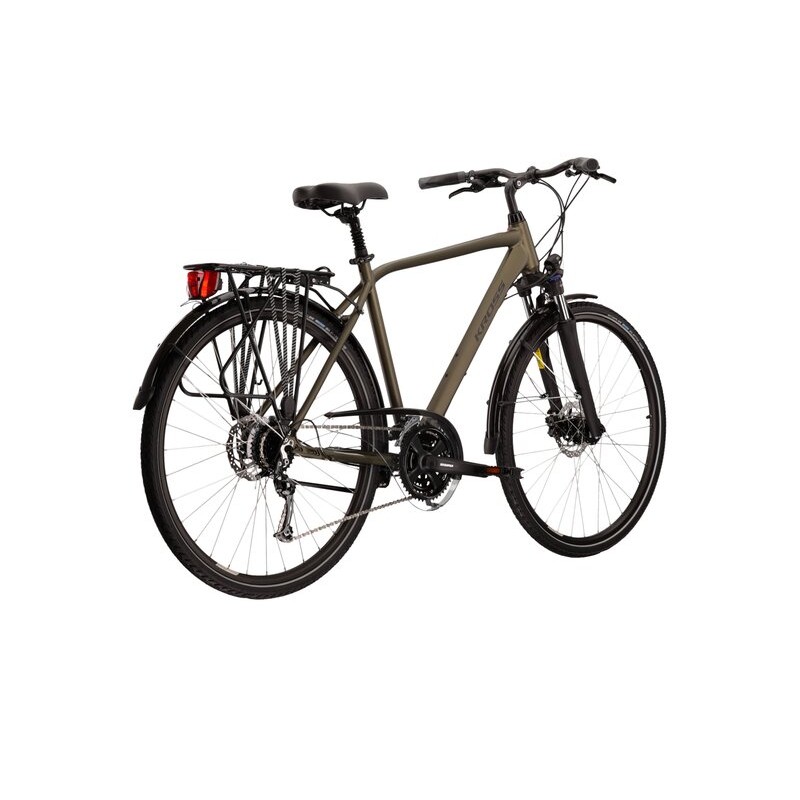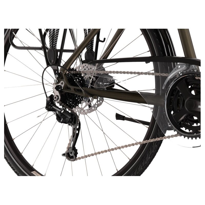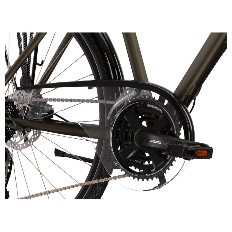 W KROSS Trans 5.0 zamontowaliśmy wysokiej jakości hamulce tarczowe, które zapewnią ci dużą siłę hamowania zarówno na asfalcie, jak i na leśnej ścieżce. Opony Schwalbe Silento 42-622 pozwalają na stosowanie roweru w praktycznie każdych warunkach atmosferycznych, a także zapewnią długą eksploatację. Ponadto wyposażony jest on w wysokiej jakości napęd składający się z komponentów Shimano. Dzięki zastosowaniu tylnej przerzutki Shimano Deore M592 oraz przedniej Tourney TY710 udało nam się uzyskać aż 24 przełożenia. Ułatwią one pokonywanie stromych wzniesień oraz rozwinięcie wysokiej prędkości na płaskich odcinkach drogi. KROSS Trans 5.0 posiada także amortyzowany widelec SR Suntour NEX, który ułatwi jazdę po nierównościach oraz zapewni komfort w trakcie jazdy po nawierzchni, która lata świetności ma już dawno za sobą.